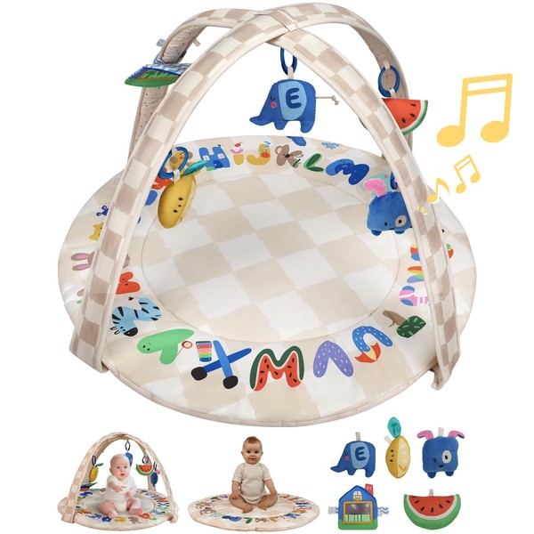 Baby Play Gym & Activity Mat with Light-up Musical Arch, Tummy Time Mat with 6 Detachable Sensory Toys for Motor Skills & Sensory Development, Baby Essentials Shower Gift - ABC123
