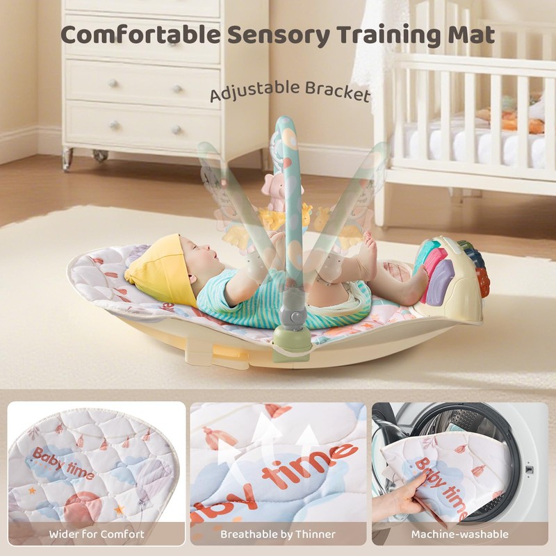 - All-in-One Baby Activity Center: This multi-functional lying training baby play gym , featuring a stable frame, breathable mat, four hanging sensory toys, and detachable musical piano toy.The eggshell-shaped support surface, which conforms to ergonomic principles, protects the baby's back. It operates silently and rhythmically, and can quickly soothe a restless baby