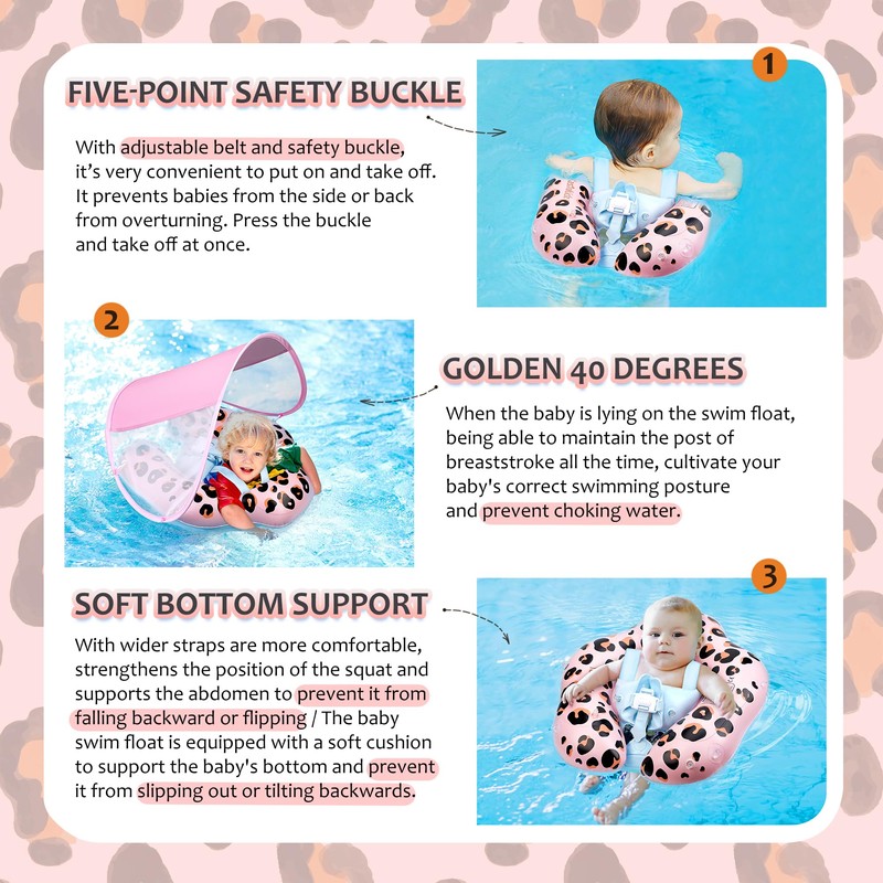 YasinKidz Baby Pool Float, Leopard Toddler Pool Float Baby Float with Canopy, Infant Pool Floats for Kids 6-36 Months Leopard+(18-33 lbs)
