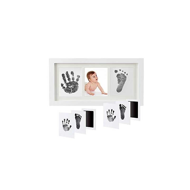- ✅PREMIUM PHOTO FRAME – Customers love our premium 13 x 7.1 inches Baby Ink Handprint Footprint Kit Photo Frame, the perfect size to hang on a nursery wall or display on a table or mantel. Timeless white frame and mat are perfect for any décor, and boy or girl. The back of the frame has a sturdy stand as well as hanging hardware. This newborn gift is built to last.