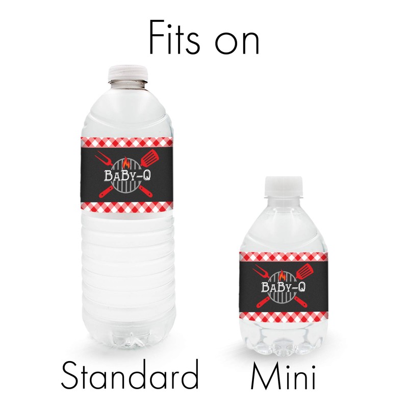 - Water Bottles NOT included. 8" x 2" WATERPROOF LABELS fit standard and mini water bottles to make summer barbecue baby gender reveal party favors for your BabyQ baby shower party.