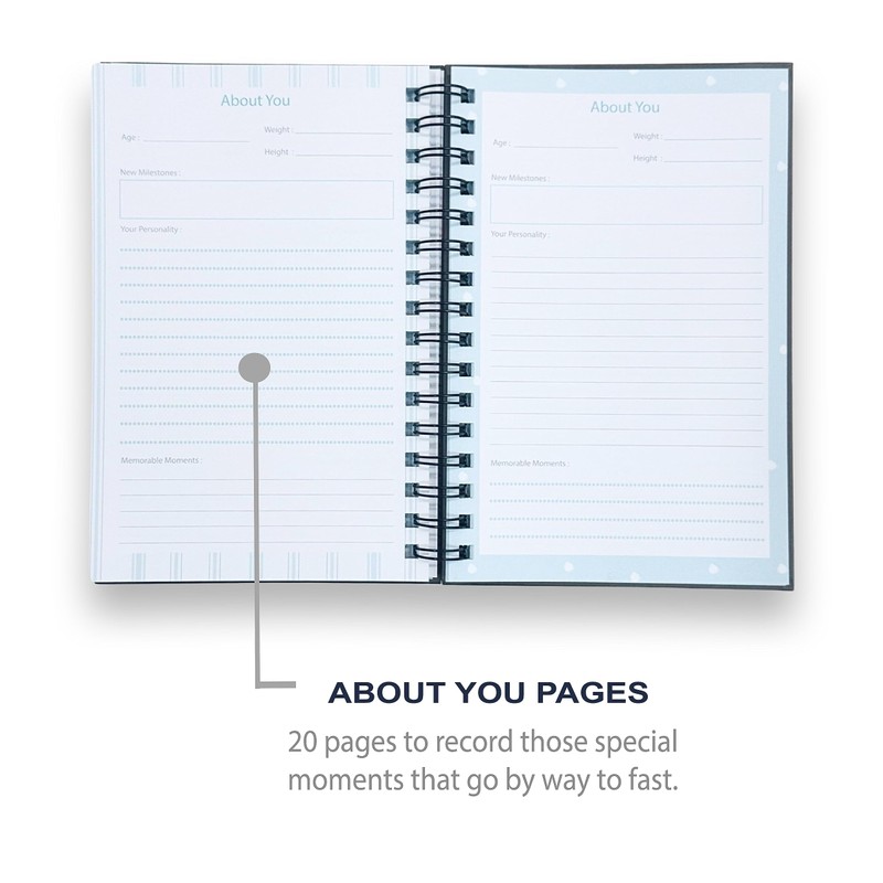 - About You Pages (20 pages)- a full page where you capture baby's age, weight, height, new milestones, personality, and memorable moments.