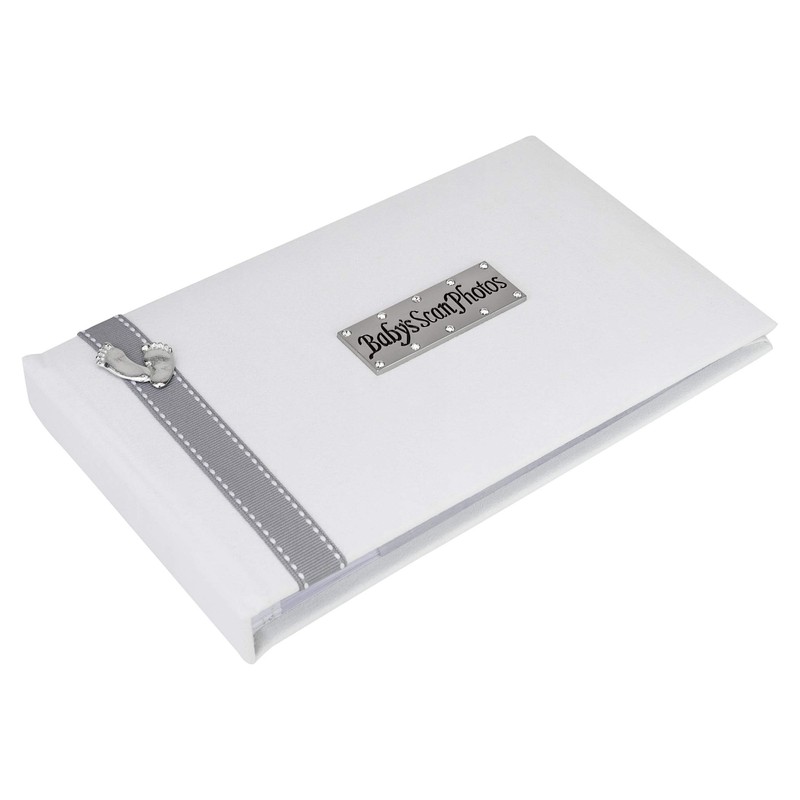 Baby's Scan Photo Album with Stitched Ribbon & Pewter Baby Feet Design - Grey Ribbon