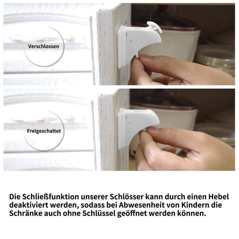 The locking function of our locks can be deactivated by a lever, so that in the absence of children, the cabinets can be opened even without a key.