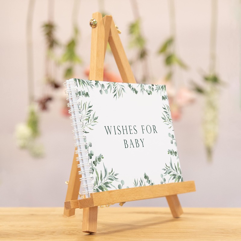 - Allow your guests to leave heartfelt wishes for your baby with this guest book, a great addition to a baby shower. A5 landscape white spiral bound book with a soft cover 350gsm and 30 sheets 170gsm which are blank.
