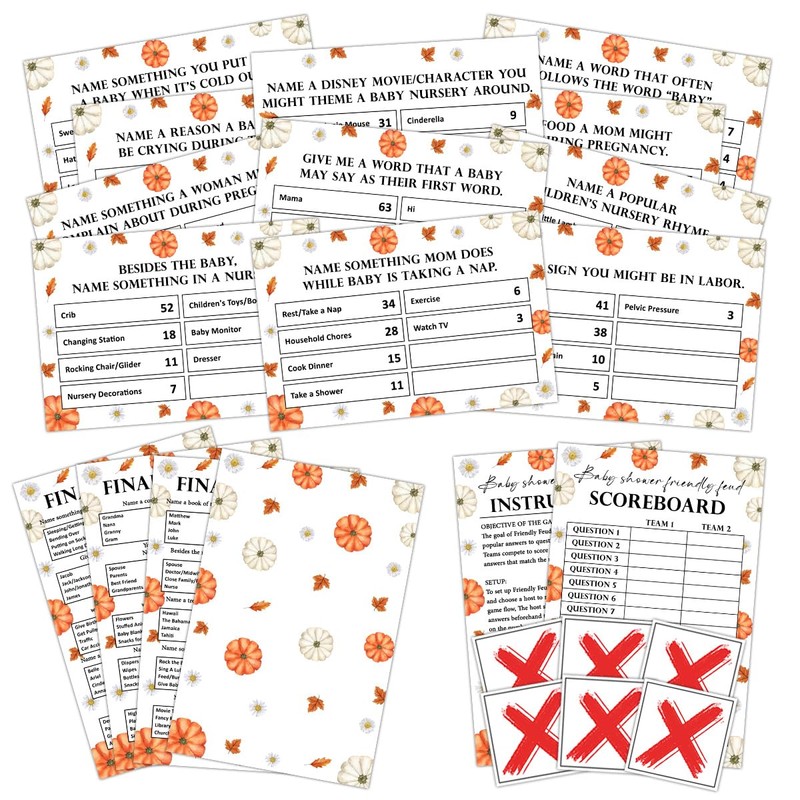 Baby Shower Friendly Feud Game, Pumpkin Funny Feud Quiz Set for Family Game Night, Fun Trivia Quiz for Adults Friend Large Group Team Building, Gender Reveal Baby Shower Party Activity Decorations -03