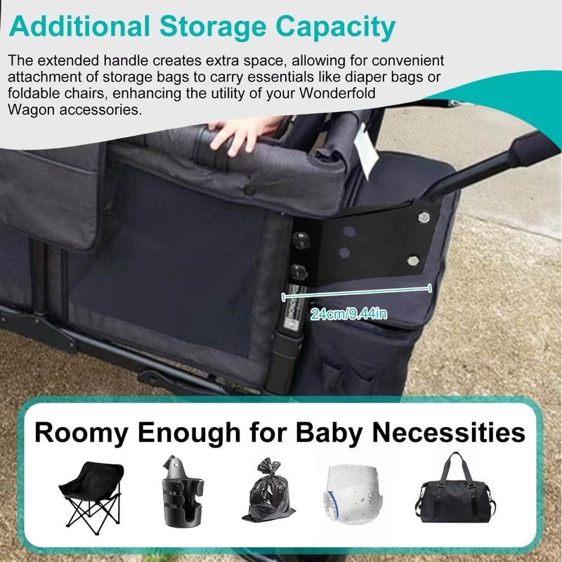 - Additional Storage Capacity:The extended handle creates extra space, allowing for convenient attachment of storage bags to carry essentials like diaper bags or foldable chairs, enhancing the utility of your Wonderfold Wagon accessories.