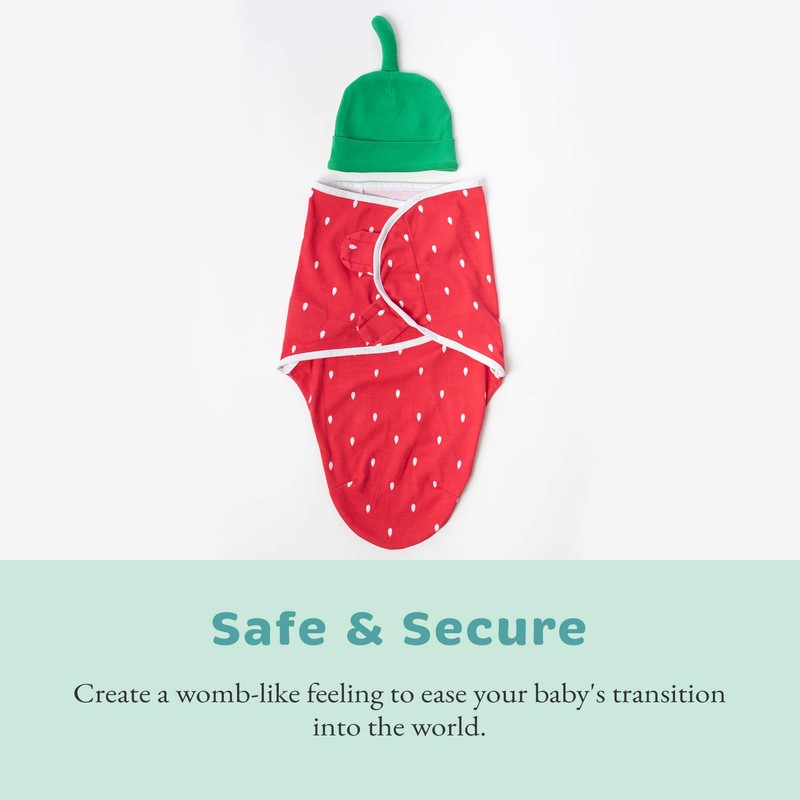 Baby Swaddle | 100% Cotton Adjustable Velcro Newborn Blanket Wrap - with Novelty Hat Beanie Strawberry