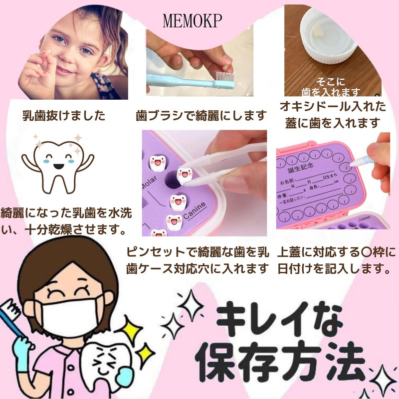 - (Write out Date): The top of the case can be written on information such as a child's name, birthday, weight, and height, so on to be clearly visible. You can also write the dental dates that have been lost within the circle of the circle around the circumference of the case, and it will fit exactly where the denture hole is located at the bottom of the case, so you can record every memory neatly