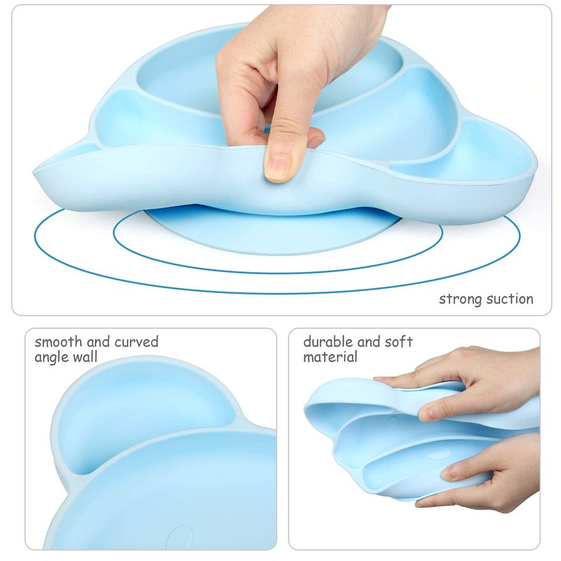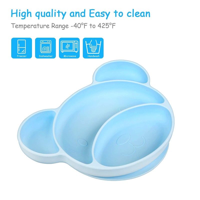 - 2.Bleiben Sie ruhig und verschmutzungsfrei: Unter der Platte befindet sich ein Saugnapf, damit er fest auf sauberen, flachen Oberflächen bleibt und Ihr Baby das Essen oder die Platte nicht beiläufig werfen kann. Infolgedessen reduziert der Teller das Verschütten und Verschmutzen von Mahlzeiten während der Mahlzeit. Darüber hinaus sind unsere Babyteller auch mikrowellen- und spülmaschinenfest, sodass sie sehr leicht zu reinigen sind.