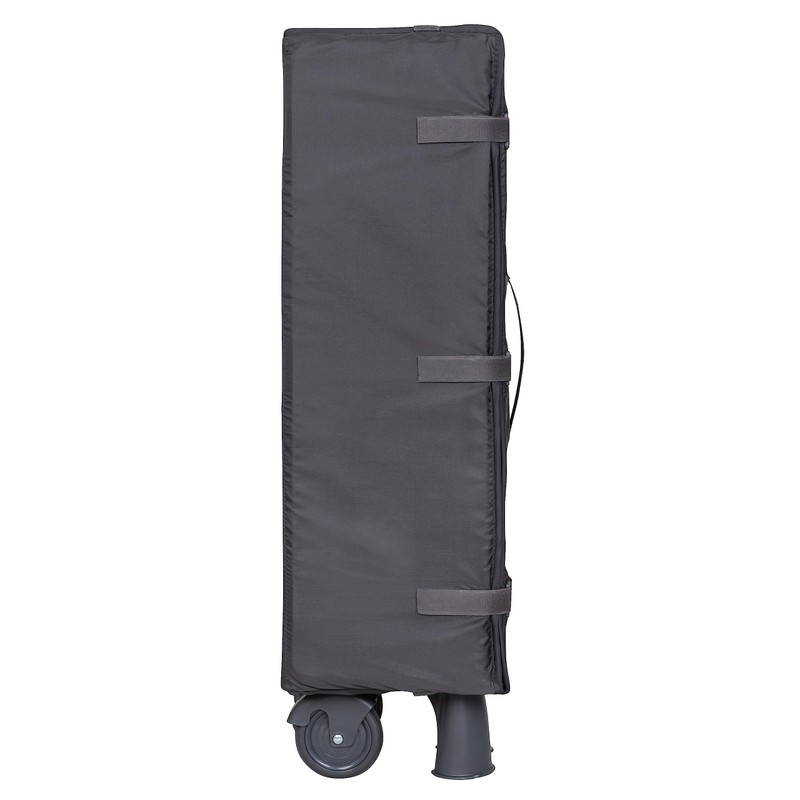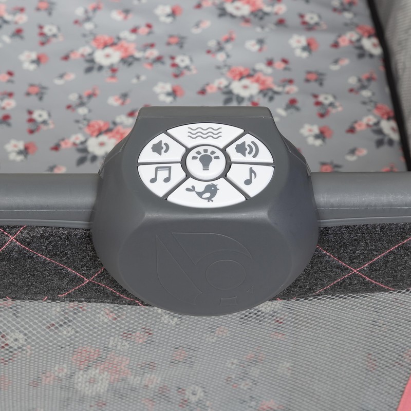- Includes: Removable full bassinet, Changing table, Deluxe Parent Organizer, Large wheels with brakes, Travel/storage tote bag, Electronic music center with volume control, nightlight, and vibration