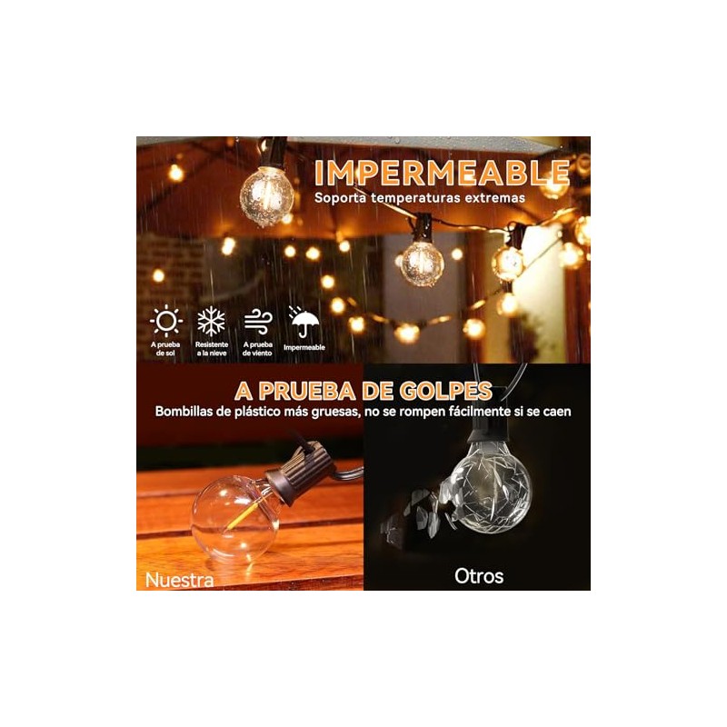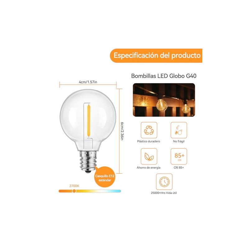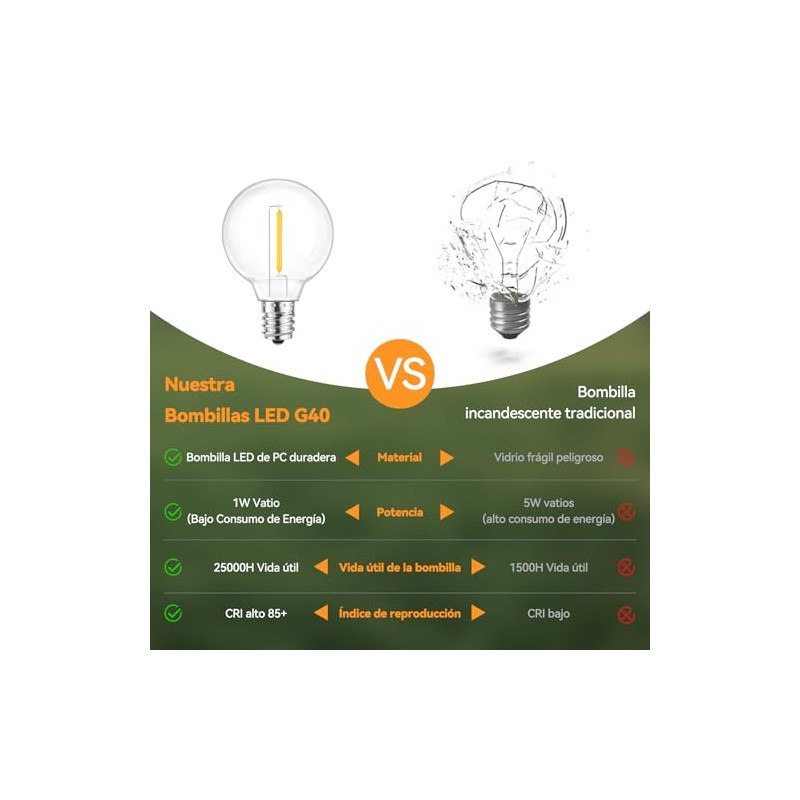 🌟 ⭐ Bacane Bombillas de Repuesto LED G40 para Guirnaldas de Luces, Bombillas Irrompibles con Base E12, 1W Igual a 5W, Blanco Cálido 2700k, Paquete de 25, No Solar ⭐ 🌟