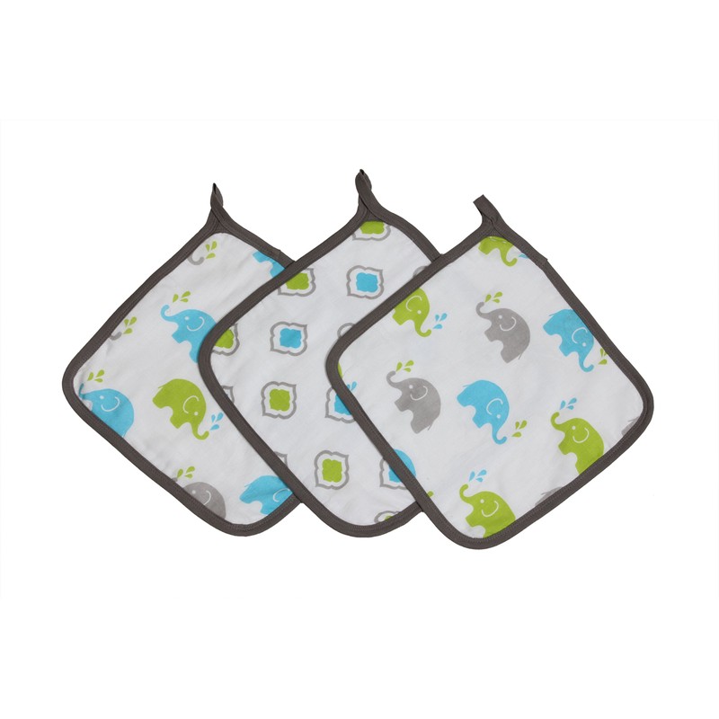 Bacati - Elephants Muslin Set of 3 Wash Cloths (Aqua/Lime/Grey)