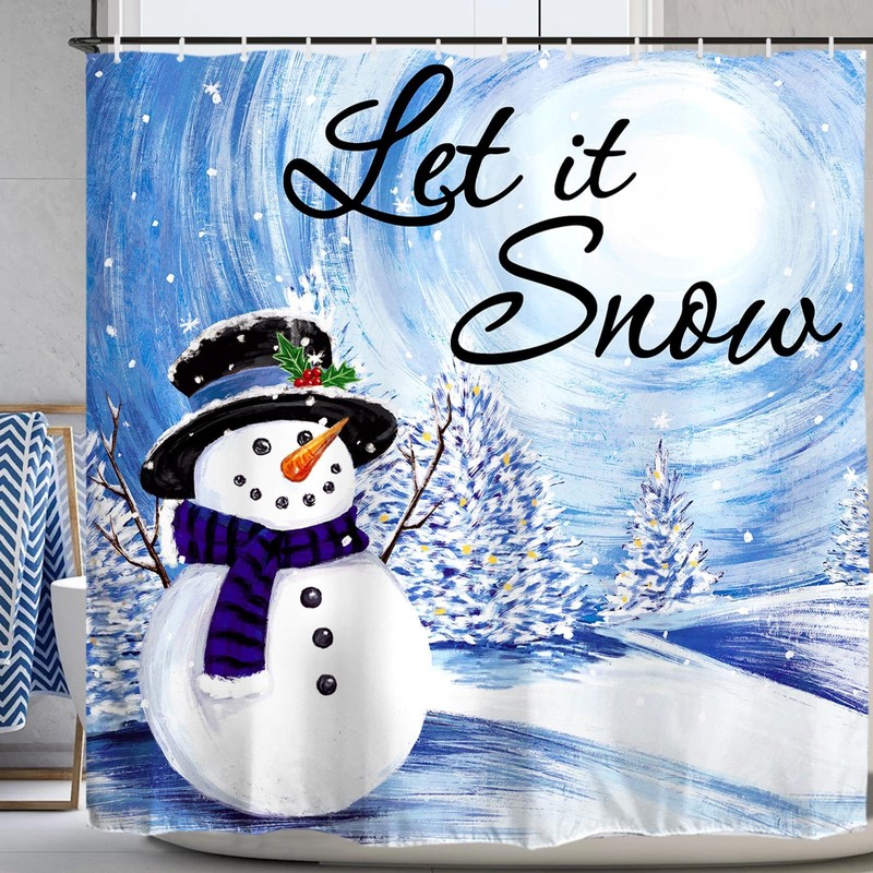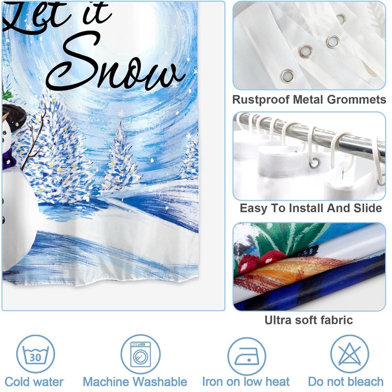 - [Construction and Easy Care] Let it snow winter snowman shower curtain contains reinforced rustproof metal grommets and 12 plastic hooks for easy hanging. Cleaning and maintenance are easy! Just toss it in the washing machine