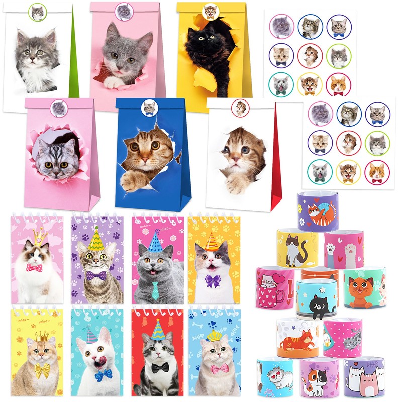 - Includes 8 Cat Theme Notebooks, 6 Cat Party Goodie Bags, 12 Slap Bracelets and 2 sticker sheets for party favors