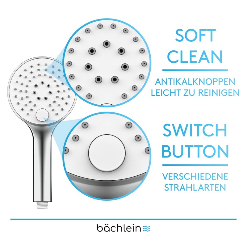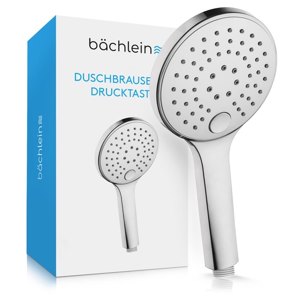 Bächlein Universal Shower Head with 3 Jet Types, Easy to Change with Practical Push Button - Round Shower Head Chrome - Hand Shower with Standard G 1/2 Inch Connection Dimensions