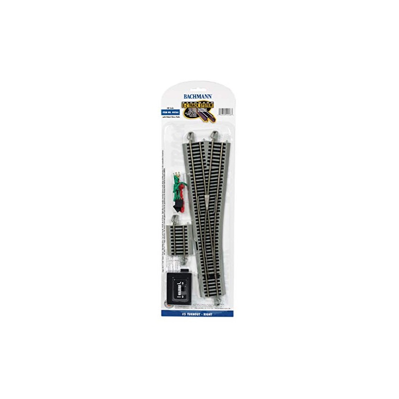 Snap-Fit E-Z TRACK #5 TURNOUT - RIGHT (1/card) - NICKEL SILVER Rail With Gray Roadbed - HO Scale. Bachmann's exclusive E-Z Track system makes set-up quick, easy and fun. E-Z Track is designed to Snap Together and Stay Together on Floors, Tables and Carpets. This product features Nickel Silver Rail with Gray Roadbed.