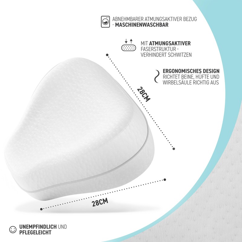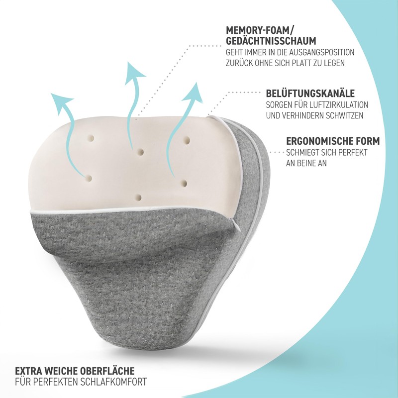 • Ergonomic design separates the knees at an ideal distance so that the hips are positioned correctly. The shape of the knee cushion fits perfectly to the legs when sleeping on the side.