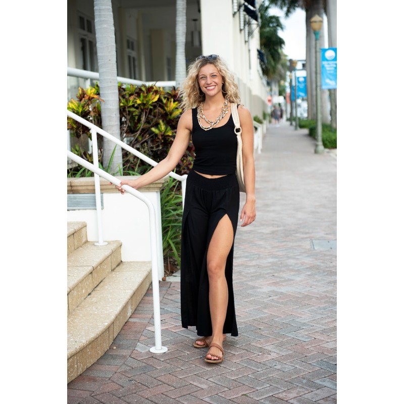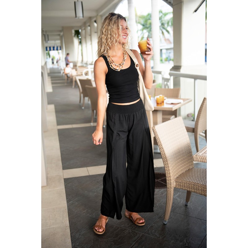 • Wide leg loose palazzo pants are the perfect beach pant. Soft and comfortable with sexy leg slits, pair these long flowy pants with a swimsuit, sports bra, or tank top