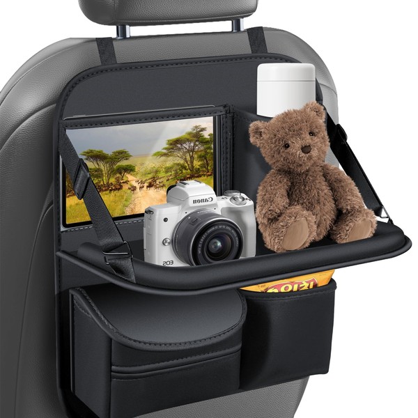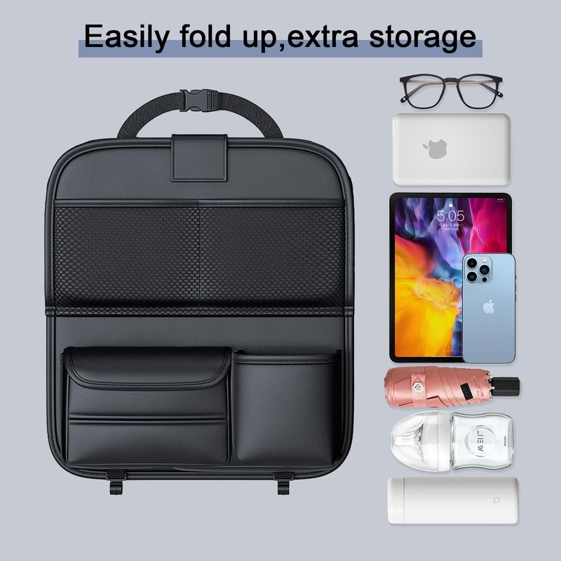 Back Seat Car Organizer with Fold-Out Tray - Upgraded Nappa Leather, with Travel Tray for Kids, Including Tissue Dispenser & Waterproof Pockets, Mainly Suitable for Autos and SUVs, Black (1)