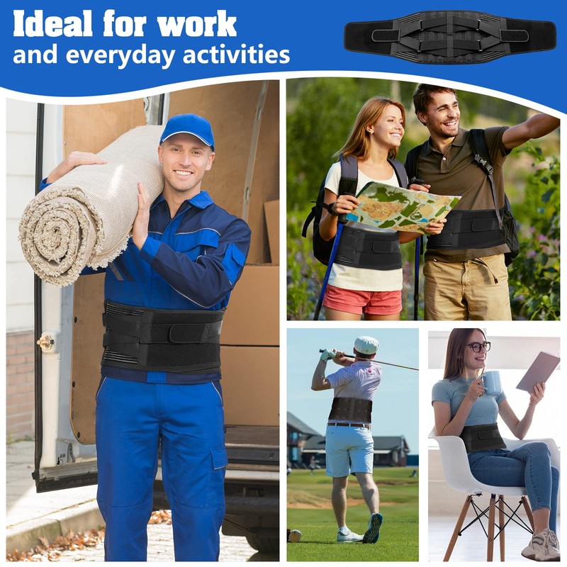 - MAXIMUM SUPPORT: Our back support belt contains 4 Memory-aluminum stays and 2 steel springs placed along the waist side, it stabilizes your back to decrease pressure on your discs, on discs, nerves, muscles, and ligaments and provides 4x more support than other brands that uses regular PP strips.