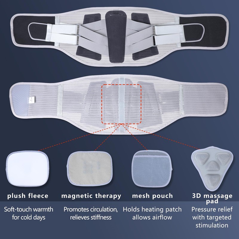 • 【Customize Your Relief – 4 Inner Pads, 1 Brace】 Whether you need warmth, massage, or anti-slip comfort, the back belt support adapts. With 4 swappable pads – magnetic therapy, plush fleece, 3D massage pad, and a mesh pouch for inserting your own heating patch – this lower back brace supports you through winter chill, summer sweat, or gym routines. Comfort meets flexibility.