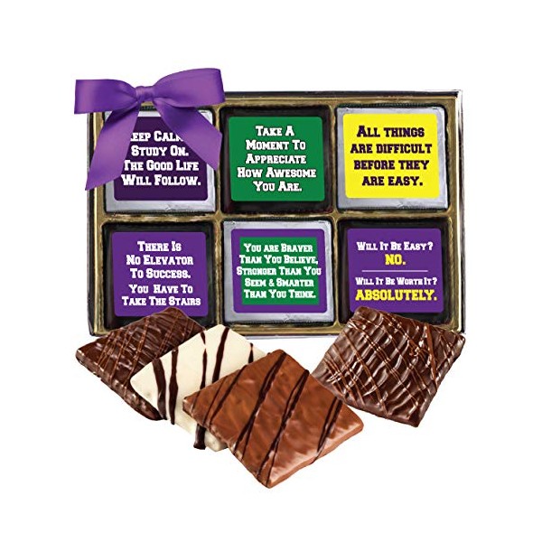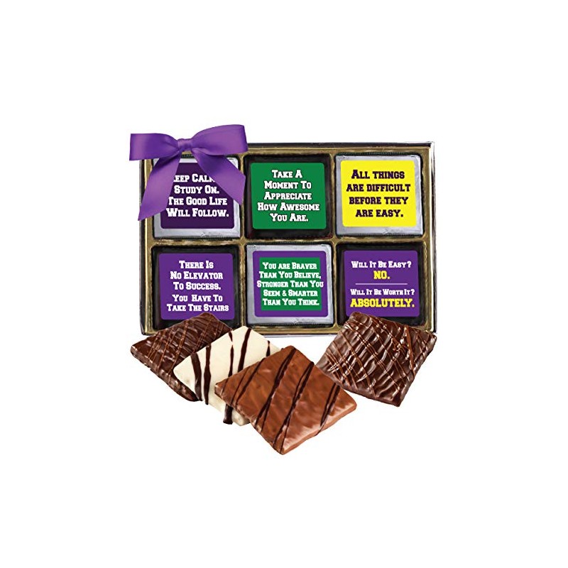 Ready-to-give delicious BACK-TO-SCHOOL themed cookie gift. Twelve delicious, chocolate-covered fresh graham cookies, specially designed for going back to school for the year. A versatile (& delicious) treat! Fresh & delicious chocolate enrobed in premium (real) chocolate graham cookies are available in all sizes, but this 12 pc gift box is a top-seller. These are popular for BACK-TO-SCHOOL because the cookies are foiled with thoughtful messages for those heading back to school. Old-fashioned chocolate grahams....ours are double-dipped. We make these in all sizes and for all occasions - but this one ships with BACK-TO-SCHOOL themed messages. Milk & Dark Chocolate assorted. Call Barb at 732.995.0497 if you need any modifications or have a special request or questions. You can also add your custom label/ logo/ photo/ church symbol on the box or cookies or attach a mini tag or gift-wrap the box at a nominal charge. Price includes 12 chocolate-enrobed Graham cookies, 6 foil- wrapped with BACK-TO-SCHOOL themed messages and 6 unwrapped chocolate grahams (underneath the foil-wrapped ones) in an elegant white box with nested tray. Truly, a nice presentation! These do not need to be gift-wrapped. They are packaged ready-to-give. This version ships with Back-to-School messaging.