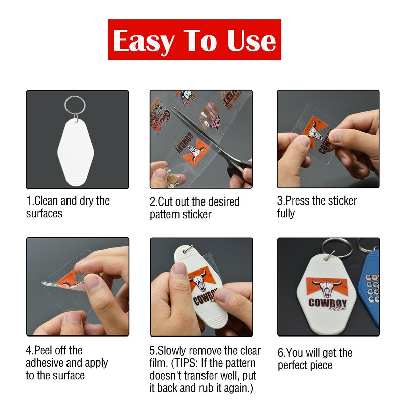 - UV DTF Wraps for Motel Keychain: This motel keychain stickers set includes 80 UV DTF stickers, featuring 20 unique designs with 4 transfer stickers each designs. You can use the exquisite uv dtf transfer stickers to DIY your blank motel keychains and other items