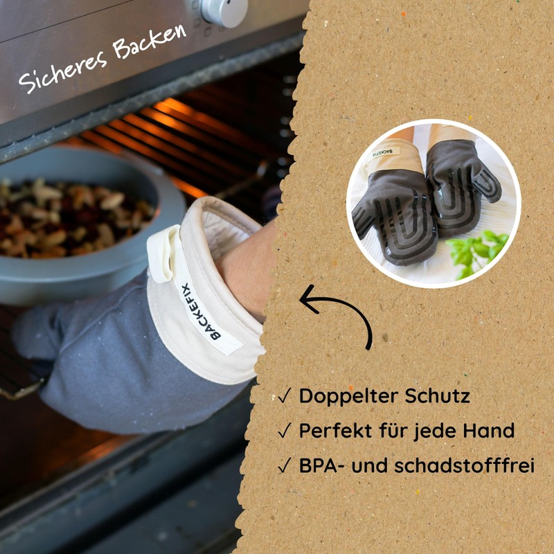 • Proofing basket for bread (23 cm), permanent silicone baking mat (44 x 33 cm), dough card plastic set (3 pieces), silicone cover oven gloves (31 x 14 cm), bag - baking bread.