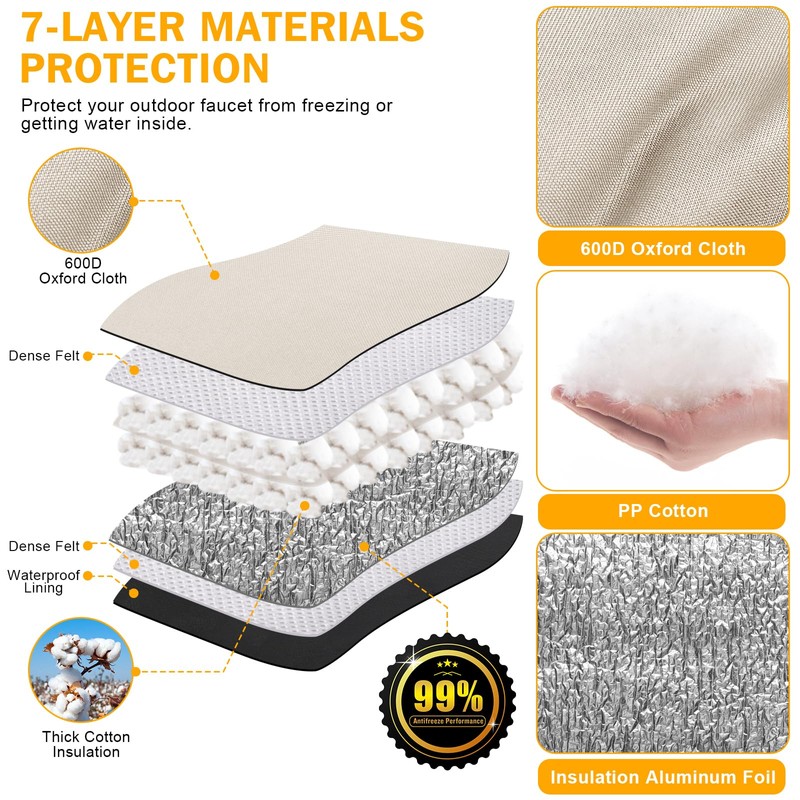 - Thickest Materials: Our sprinkler backflow cover for winter is the thickest you can currently find on Amazon.com! The sprinkler cover for the outside is made of 7 layers of material. The outer layer is 600D Oxford Fabric with a water-repellent effect, the inner is two layers of non-woven fabric, two layers of PP cotton with thermal insulation, a layer of aluminum foil with a thermal insulation effect, and a layer of waterproof lining. They help keep your pipes warm and from bursting during the freeze