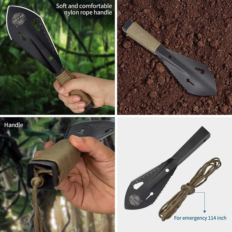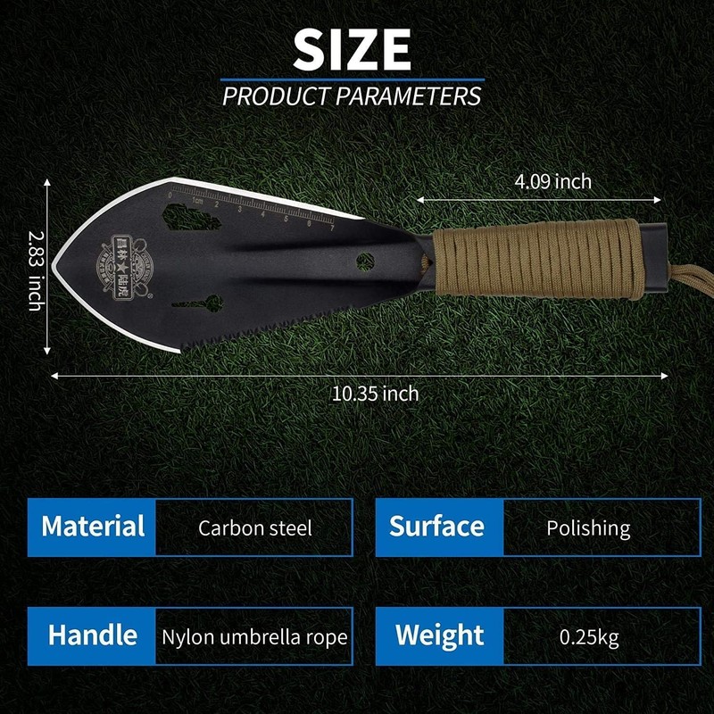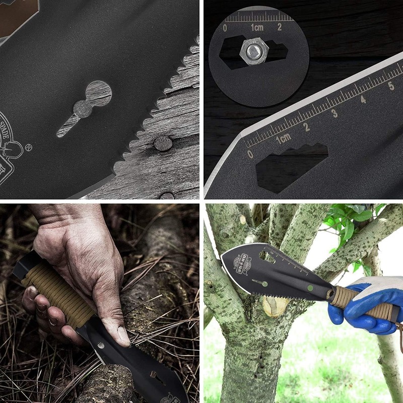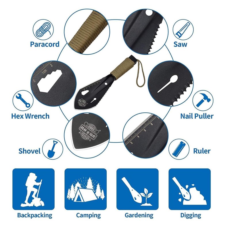 - Multifunctional:This portable shovel trowel features a regular trowel doesn't even have: Shovel Blade, Saw, Ruler, Nail Extractor, Hex Wrench, Paracord.