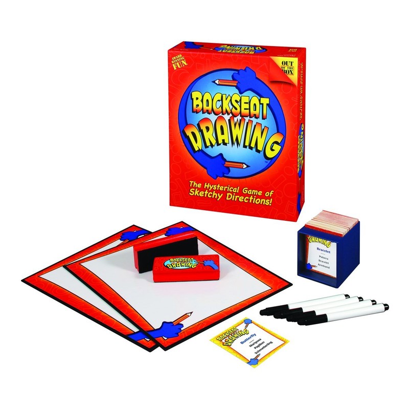 Two teams race to identify drawings done by their own team members. But, the artists don’t know what they are drawing--they can only follow the instructions given by another team member. Laughter erupts as players attempt to follow direction and to guess what is being drawn. With backseat drawing, there's no time to stop and ask directions-- the fun never stops.