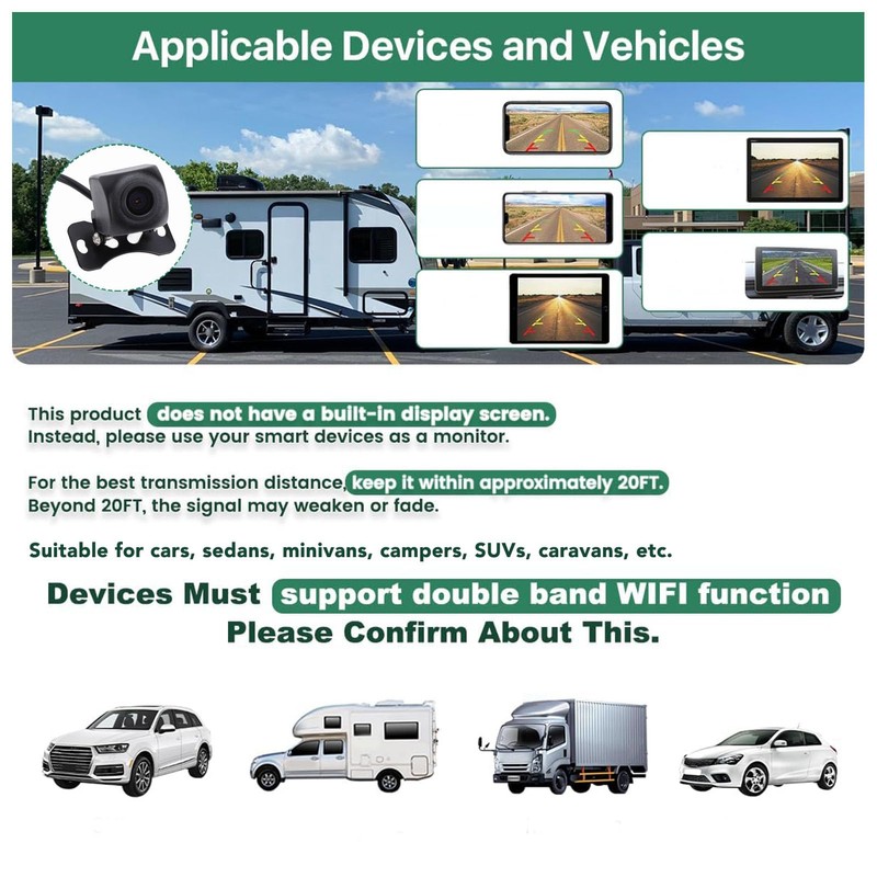 - Compatible: In addition to for IOS phone, for IOS tablet, for Android smartphones and tablets, the reversing camera can also be compatible for Android hosts, supporting app download and internet connection.