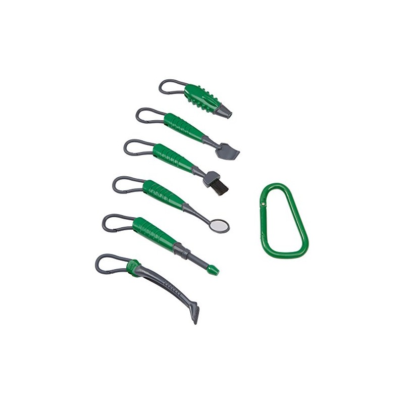 Backyard Safari 6 in 1 Field Tools lets little ones shovel, brush, grab or probe. Whether gathering samples or excavating that dig site, up close or in hard to reach spaces, these sturdy tools will handle hundreds of field tasks. Clipped to your Cargo Vest, they stay within reach to snap off - and back on - with single-handed ease. And when you discover that interesting find, signal the rest of your field crew with the high audible field safety whistle. Recommended for children 5 years of age and older.