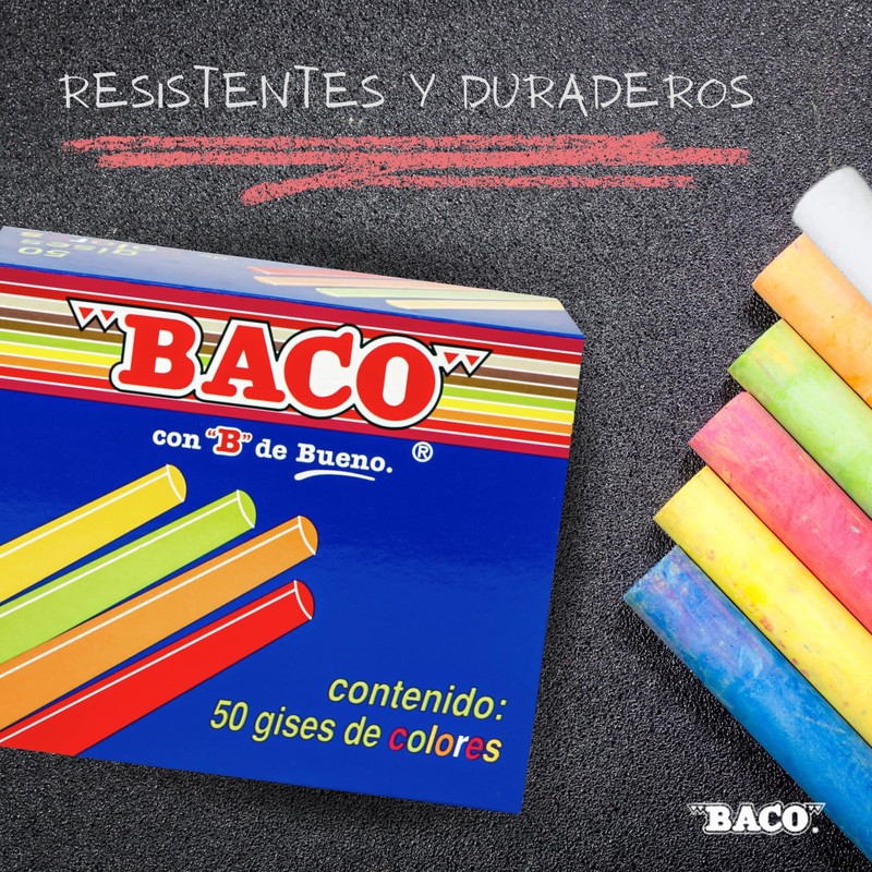- Perfectos para entornos educativos como una herramienta indispensable para enseñar y aprender en el aula. Los gises BACO son ideales para una variedad de aplicaciones, como escritura en pizarras, dibujo en papel oscuro o marcado en superficies no porosas. Adecuados para estudiantes, profesores, artistas y más.