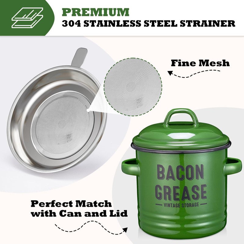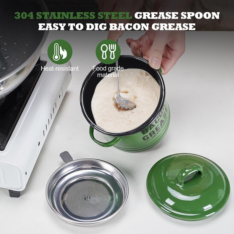- Perfect Design for Grease Storage – Our set includes a bacon grease container, stainless steel fine strainer, and spoon, designed to effortlessly strain and store excess oil from frying. This grease saver helps reduce oil waste while keeping your kitchen clean. Practical, durable, and easy to clean—it’s the perfect storage to your kitchen essentials.