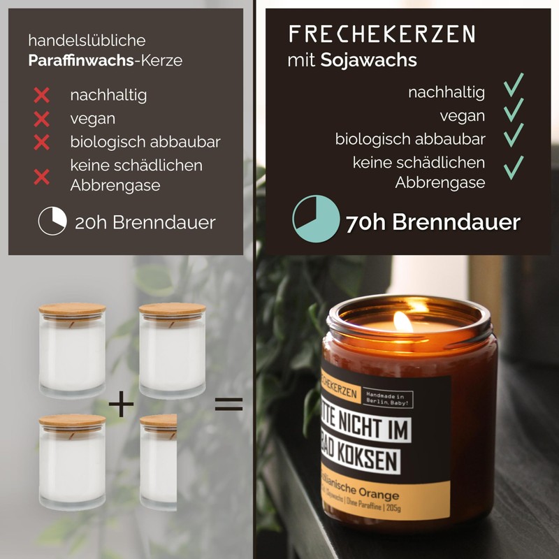 - SOJAWACHS DUFTKERZE: Kerzengröße: 9,2 x 7,3 cm; Gesamtgewicht: 420g. Jede Kerze wird schmunzelnd von uns in Berlin hergestellt. Unsere Kerzen bestehen aus 100 % natürlichem Sojawachs und haben einen Baumwoll-Docht.