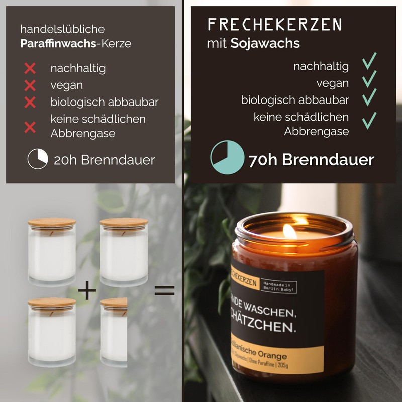 - SOJAWACHS DUFTKERZE: Kerzengröße: 9,2 x 7,3 cm; Gesamtgewicht: 420g. Jede Kerze wird schmunzelnd von uns in Berlin hergestellt. Unsere Kerzen bestehen aus 100 % natürlichem Sojawachs und haben einen Baumwoll-Docht.