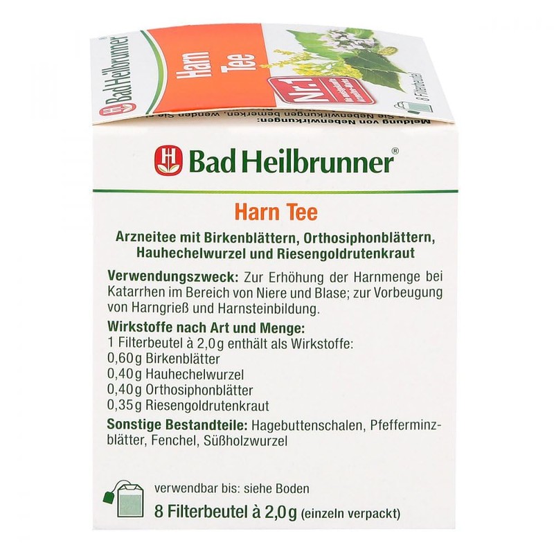 Ingredients: 1 filter bag of 2.0 g contains as active ingredients: 0.60 g birch leaves, 0.40 g of hacking root, 0.40 g orthosiphon leaves, 0.35 g giant goldroid herb. Other ingredients: rosehip peel, peppermint leaves, fennel, licorice root; young people from 12 years and 12Adults drink 3-4 times a day before or after the meal (approx. 2 hours) freshly brewed tea. Prepare the tea and drink it immediately. To do this, pour 1 filter bag with boiling water (approx. 150 ml) and let the tea infusion approx. 10 minutes.