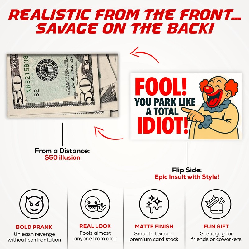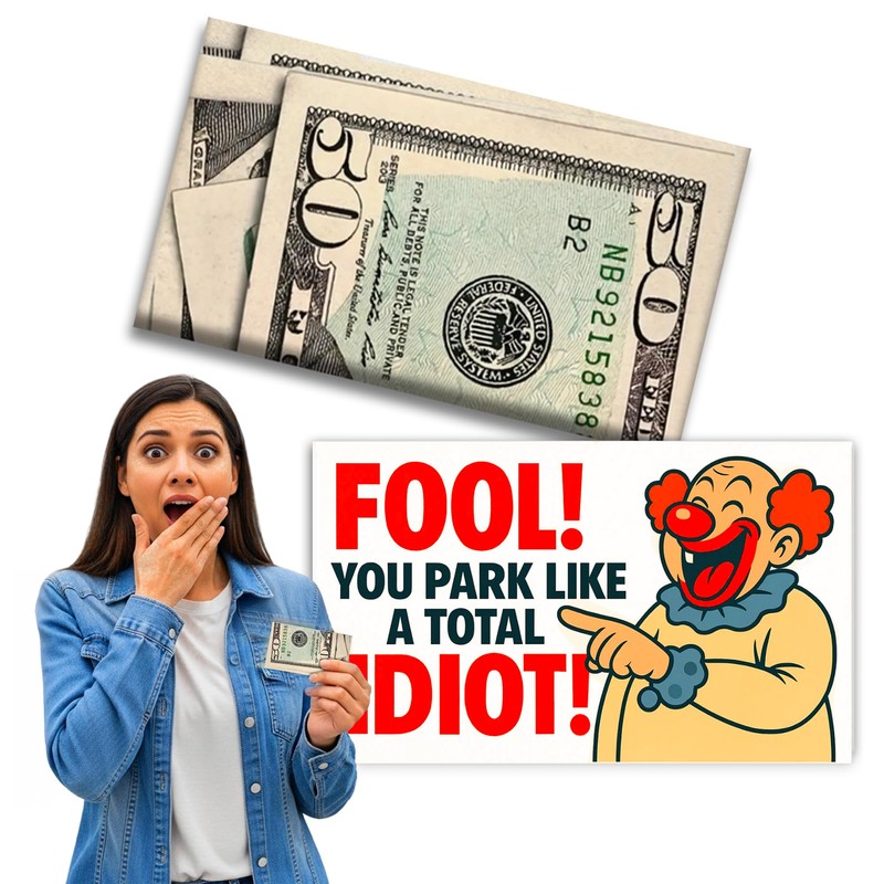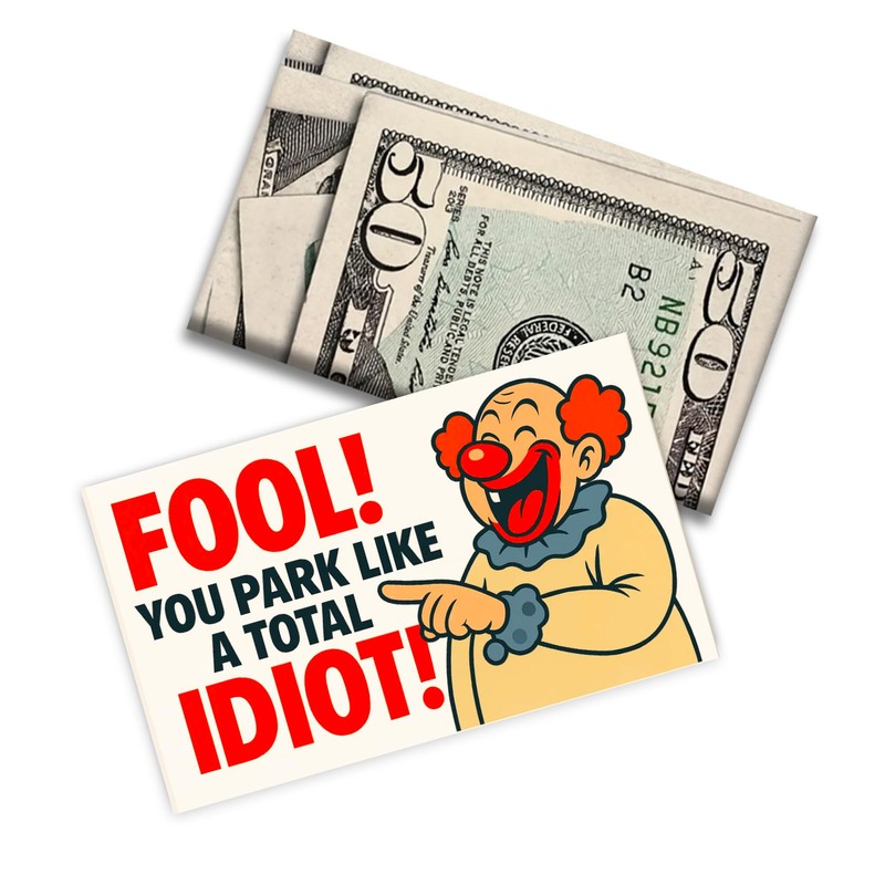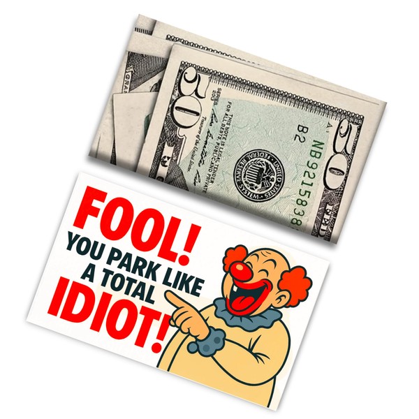 Bad Parking Prank Cards – “You Park Like an Idiot” – Realistic $50 Bill Gag Gift – 50 Pack Funny Parking Ticket Notes