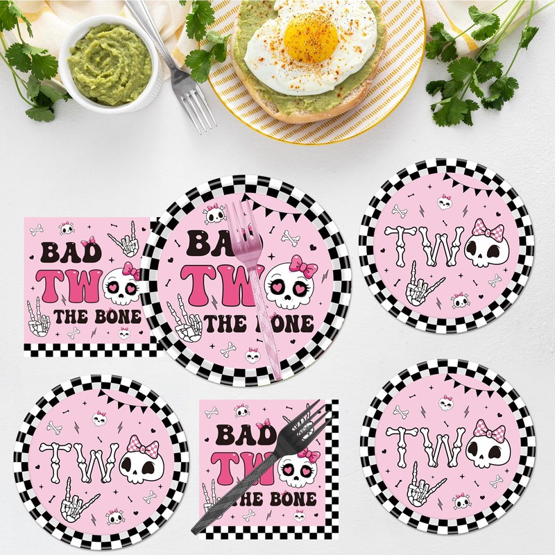 - What’s Included: This 96-piece set includes 24 pieces dinner plates, 24 pieces dessert plates, 24 pieces napkins, and 24 pieces pink forks—enough to serve 24 guests. Featuring bold pink skulls, playful "Bad Two the Bone" phrases, and the number "2," it’s ideal for a fierce yet girly 2nd birthday celebration
