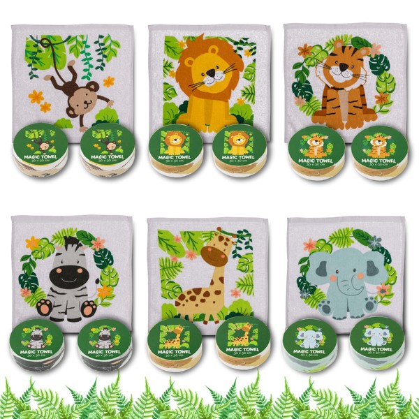 - Total contents: you will receive a set of 12 magic towels in six different safari animal motifs. Usually you get two giraffes, two monkeys, two elephants, two tigers, two zebras and two lions.