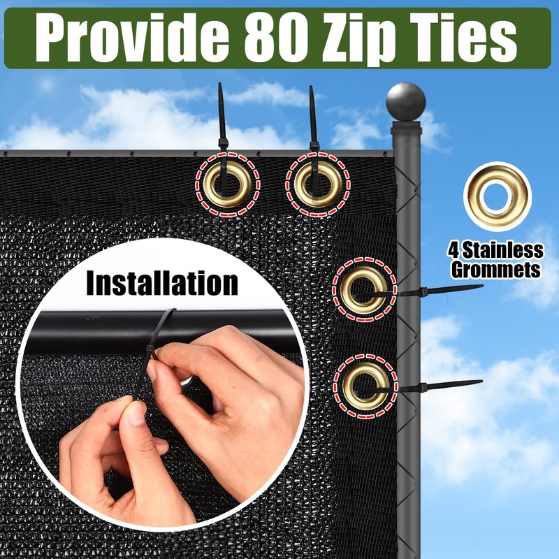 - Perfect Fit & Easy Installation: Our Privacy Screen Fence measures precisely 4' x 50', making it a perfect fit for fences 4 feet or slightly taller. It can be easily installed on chain link fences, existing cyclone wire fences, wooden retaining walls, welded wire fences, and more. For easy and secure installation, we've included grommets placed vertically every 1 foot and horizontally every 2 feet, with 4 grommets at each corner. We also provide 80 zip ties for added convenience.