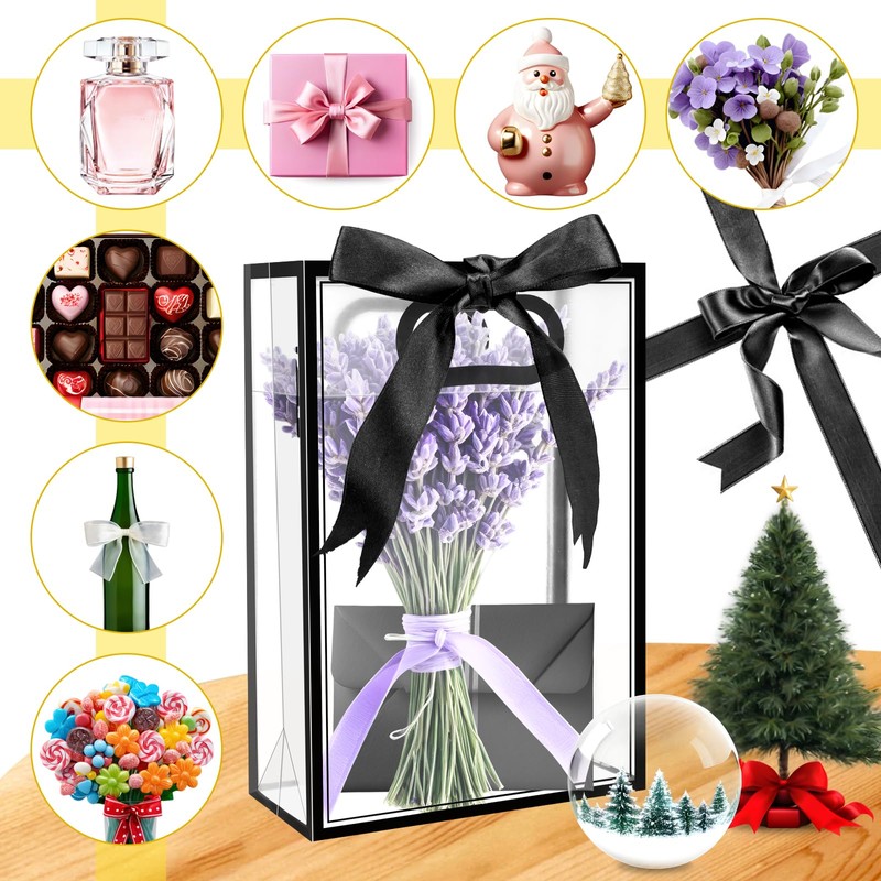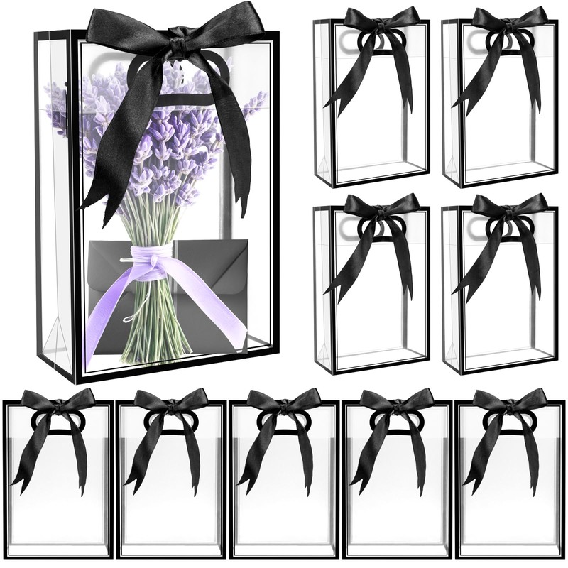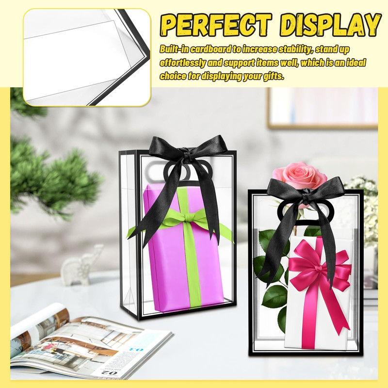 - ELEGANT DESIGN: Our plastic gift bags are fully transparent, making it easier and more intuitive to display the beauty of your gifts. The simple yet elegant black border adds a sense of sophistication to your gift, and you can also use the included high quality ribbon to tie a beautiful bow on the handle of the clear gift bag, which enhances the gift experience and adds a decorative effect