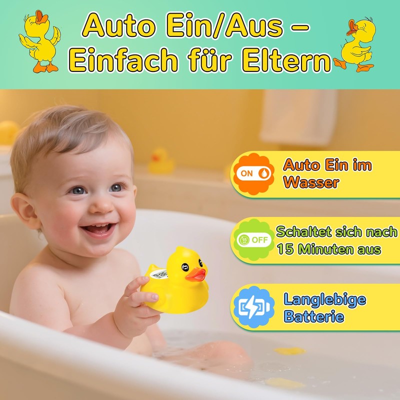 - 𝐀𝐮𝐭𝐨𝐦𝐚𝐭𝐢𝐬𝐜𝐡𝐞𝐬 𝐄𝐢𝐧- 𝐮𝐧𝐝 𝐀𝐮𝐬𝐬𝐜𝐡𝐚𝐥𝐭𝐞𝐧 – Das Badethermometer Baby aktiviert sich im Wasser automatisch und schaltet sich nach 15 Minuten Inaktivität von selbst aus. Keine Knöpfe – einfach, energiesparend und komfortabel