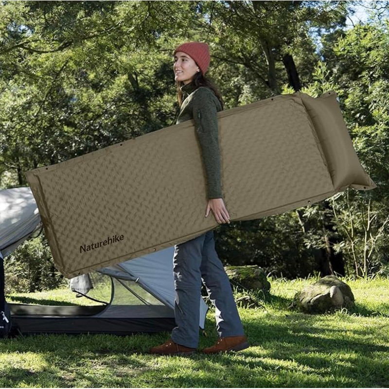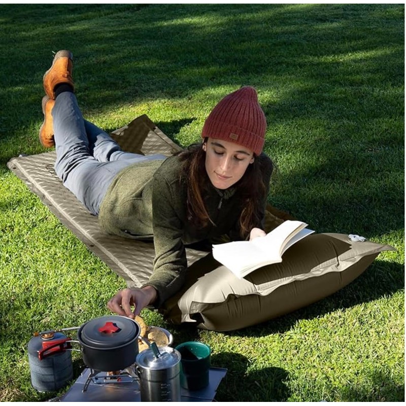 COMPACT & PORTABLE: Open size: 78.7"(L)x24.8"(W)x2"(H); Rolled size: 13"x7.5"x7.5"; Weight: 2.7lbs). Two compression straps and a storage bag for easy storage and carrying. 2 INCHES THICKNESS: The unfolded thickness after compression is 0.4"~0.8", the thickness can reach about 1.8" after 15 minutes of standing, and it can reach 2" when fully inflated. Use auxiliary blowing to enhance the use effect of the camping mat for the first time. SELF-INFLATING CAMPING PAD: Double valve design, shorten the time of inflation/deflation. Using 190T pongee waterproof fabric and 19 times sponge, it is silent, thick, and elastic, without plastic and chemical smell. This self-inflating sleeping pad and pillow provides firm support and helps you get a pleasant sleep at night. JOIN MORE MATS WITH BUTTONS:The comfortable self-inflating cushion has two rows of buttons for splicing into a double sleeping pad or even a multi-person sleeping pad, suitable for any outdoor activities, such as backpacking, hiking, outdoor, travel, beach camping, car travel or camping.