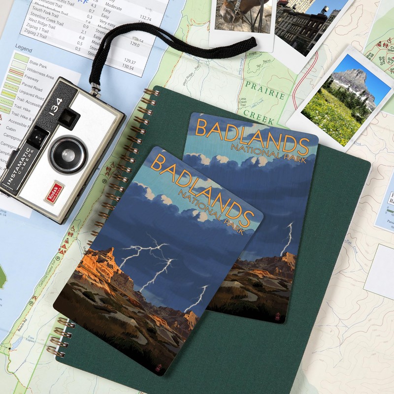- Badlands National Park, South Dakota, Desert Lightning Storm (4x6 Birch Wood Postcards, 2-Pack Stationary, Rustic Home Wall Decor), high-quality sustainable wood printed in Seattle