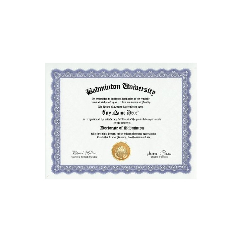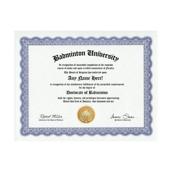Badminton Degree: Custom Gag Diploma Doctorate Certificate (Funny Customized Joke Gift - Novelty Item)