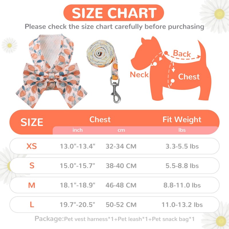 - Pretty Dog Harness Leash Set:This dog harness with a large bow and flower pattern design is fashionable.With daisy pattern, this dog vest harness becomes more beautiful.Put it on and your dog girl will instantly become an elegant and beautiful princess