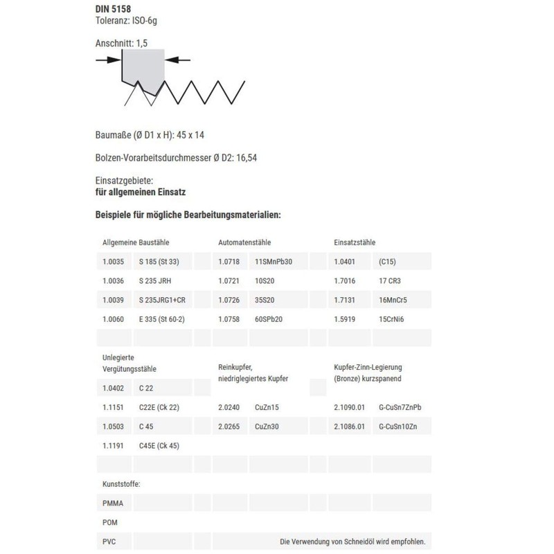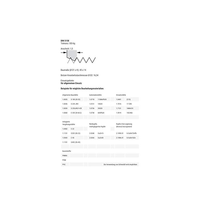 - Product information: Baer die G 3/8 x 19 - HSS | DIN 5158 tolerance: ISO 6g | cut: 1.5 | dimensions (diameter D1 x H): 45 x 14 | bolt preparation diameter D2: 16.54 | areas of application: for general use